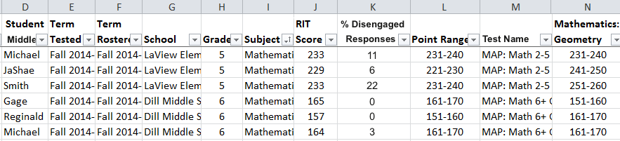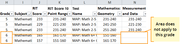 • For a meeting of all 6th grade math teachers, you could sort by the Geometry column to see which students have lower achievement in that area, across all classes.