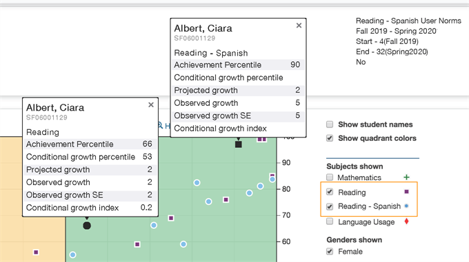 When you test students with MAP Growth Spanish Reading, you can expect to find results similar to the English Reading tests, with a few exceptions. For example, you could use the Achievement Status and Growth Report to compare scores of a student who completed both Spanish and English Reading tests: