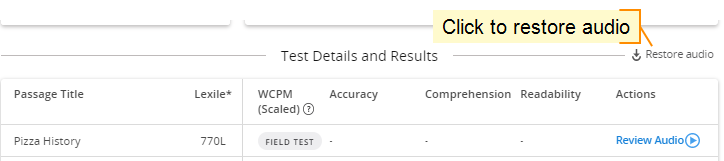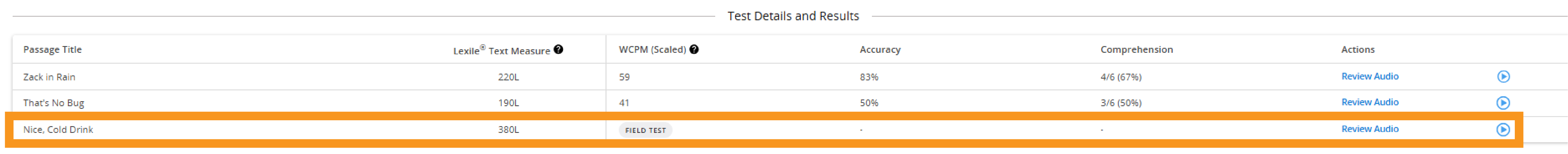 Results from field test passages and measures populate the Individual Student report. Field test passages generate a Lexile score and an audio file under the Test Details and Results section and display “Field Test” for the associated passage.