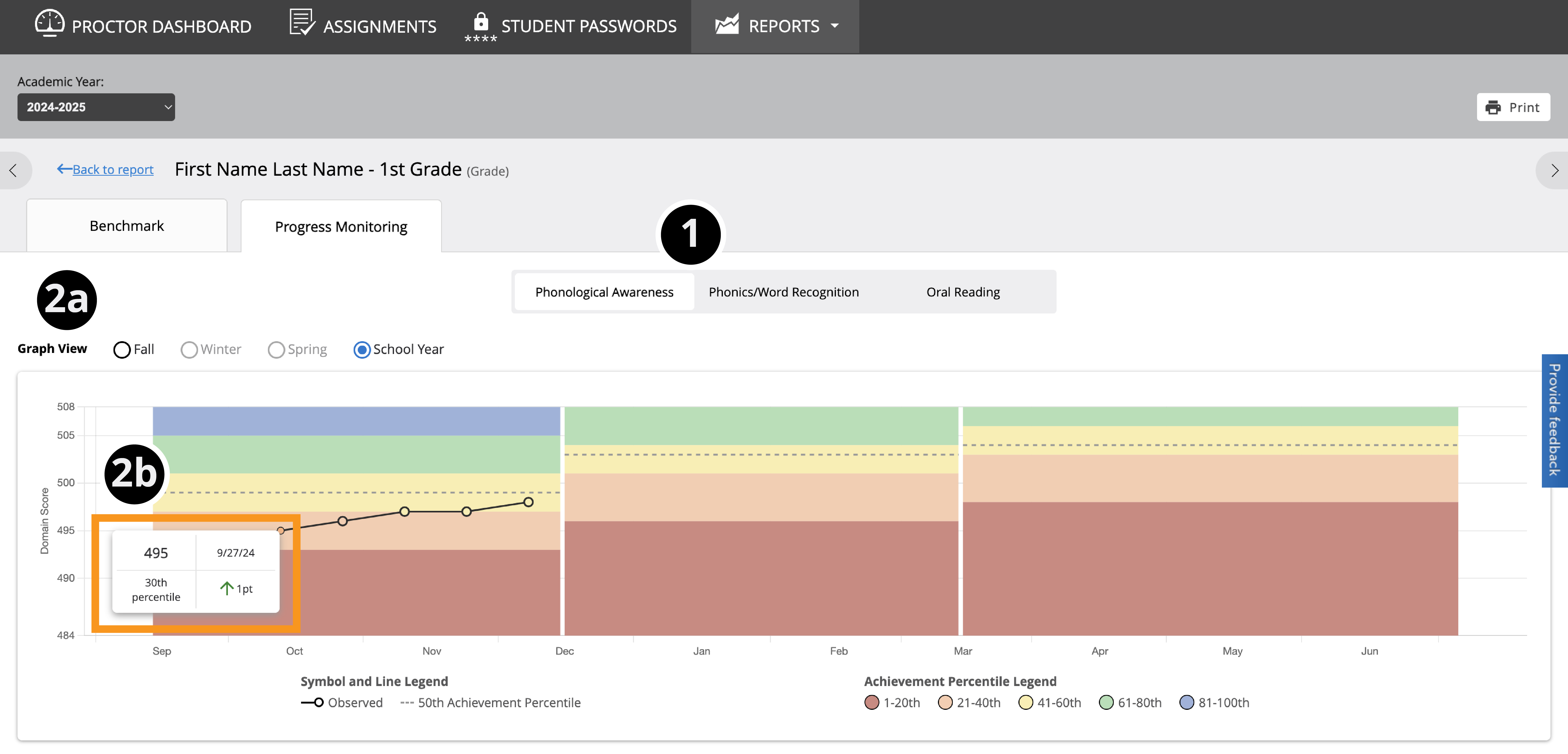 Students who completed one or more Progress Monitoring tests will have data in the Progress Monitoring tab of their Individual Student report. Learn more about how to access and interpret the Progress Monitoring data using these annotated graphics and corresponding numbered steps.